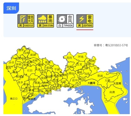 【深圳市扩展分区雷雨大风黄色和暴雨黄色预警信号】深圳市气象台2025年08月14日06时55分将分区雷雨大风黄色和暴雨黄色预警信号扩展至珠江口和深圳湾海域,预计1-2小时内最大阵风将达8级左右,并伴有强降水和雷电,请落实各项防风防雷电措施。