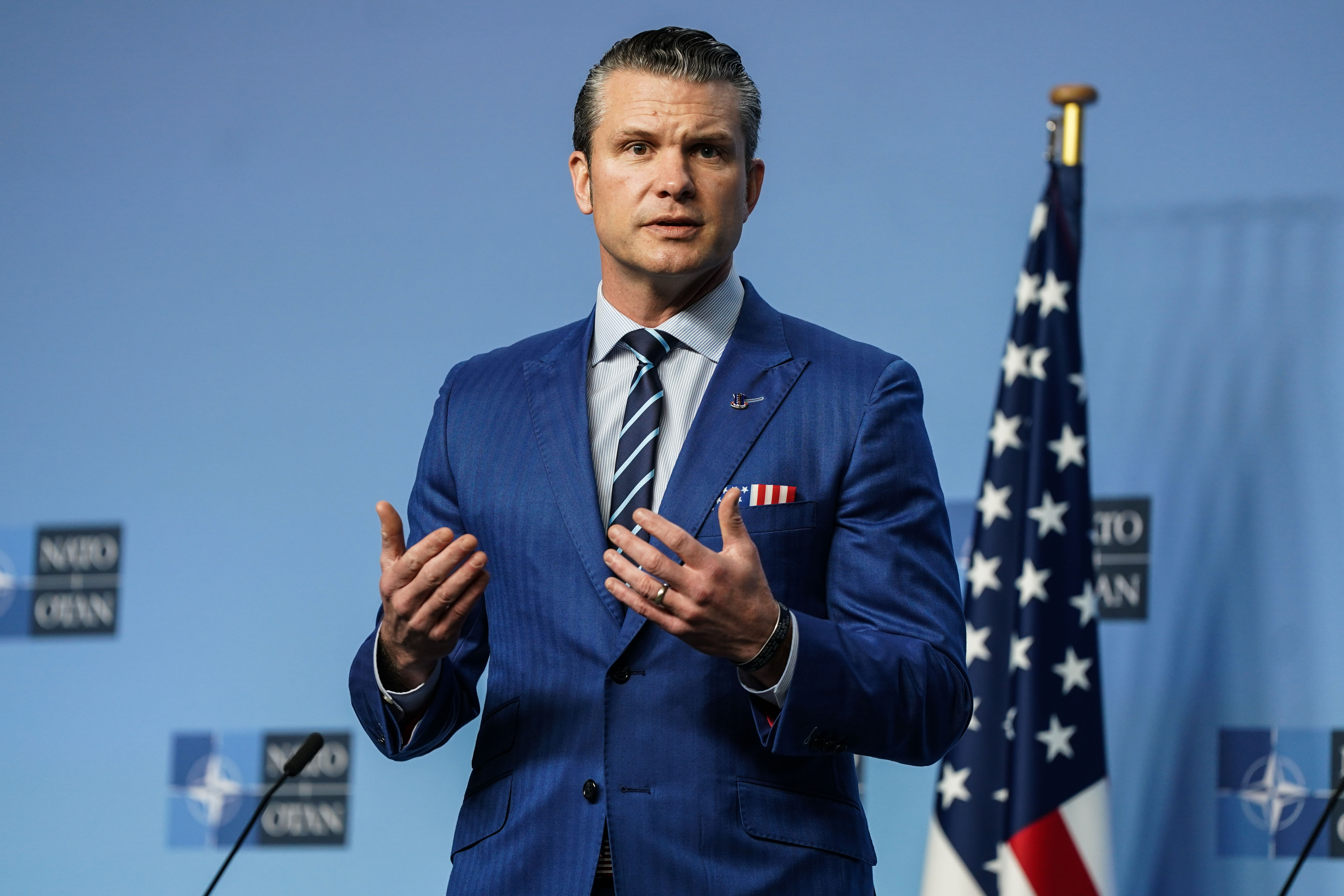2月13日,在比利时布鲁塞尔,美国国防部长赫格塞思在北约一场发布会上讲话。新华社记者彭子洋摄